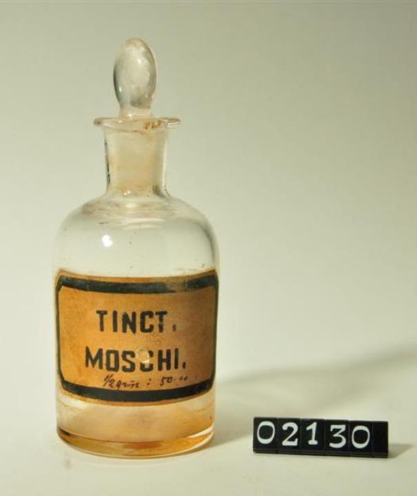 Runde, farblose Enghalsflasche mit eingeschliffenem Griffstopfen (Massivstopfen). Abgeschliffener Hefteisenabriss. Ausladender, flacher Mündungsrand. Schwarz signiert