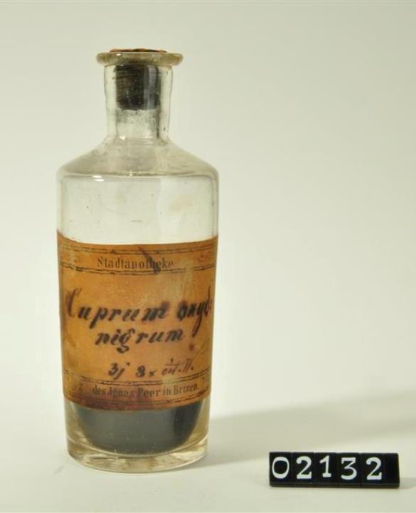 Runde, farblose Enghalsflasche mit Korkstopfen. Leicht hochgestochener Boden mit rundem Hefteisenabriss. Ausladender, flacher Mündungsrand. Etikettiert