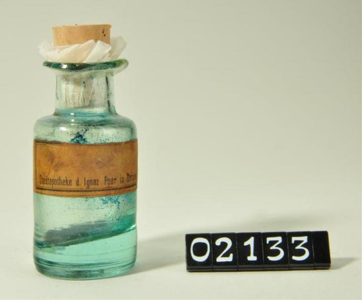 Runde, hellgrüne Enghalsflasche mit Korkstopfen. Leicht hochgestochener Boden mit Hefteisenabriss. Trichterförmig ausladender, unregelmäßiger Mündungsrand. Etikettiert