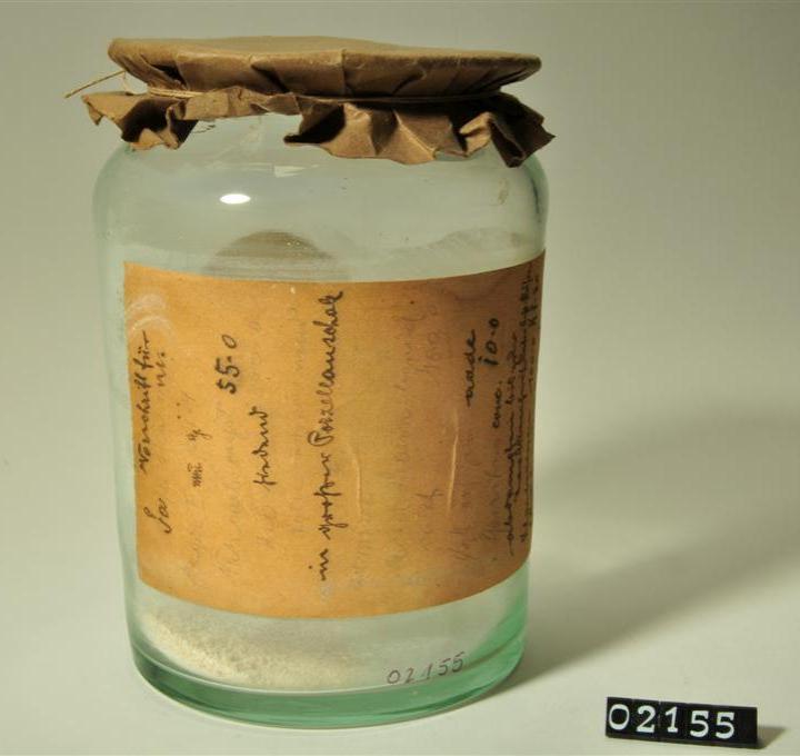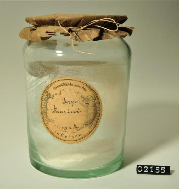 Rundes Bindeglas mit Tektur aus farblosem Glas mit Grünstich. Hochgestochener Boden mit Hefteisenabriss. Rundes Etikett der Stadtapotheke des Ignaz Peer, datiert 05. März 1913. Rückseite Vorschrift für Sapo stearinicus. Enthält Stearinseife.