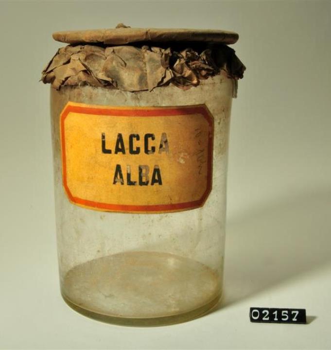Rundes, farbloses Bindeglas mit Tektur. Hochgestochener Boden mit rundem Hefteisenabriss. Achteckiges Schild mit rotem Rand, schwarz signiert. Enthielt weißen Schellack.