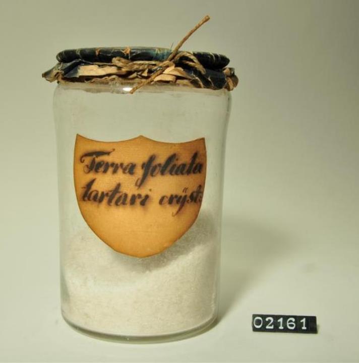 Rundes, farbloses Bindeglas mit Tektur. Hochgestochener Boden mit rundem Hefteisenabriss. Schwarz signiert auf Schweizer-Schild-förmigen Papierschild. Enthält essigsaures Natron = kristallisierte Weinsteinblättererde.