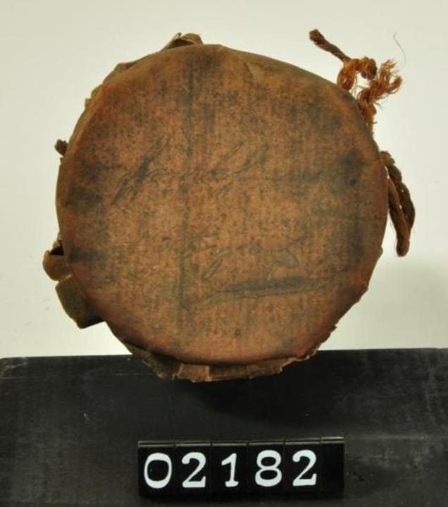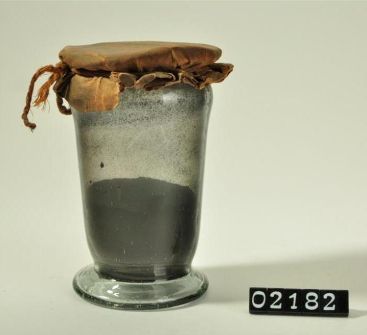 Konisch zulaufendes Bindeglas mit angeschmolzener Fußplatte und ausgebogener Lippe aus rauchfarbenem Glas, mit beschrifteter Tektur. Hochgezogener Boden mit Hefteisenabriss und gestauchtem Fuß.