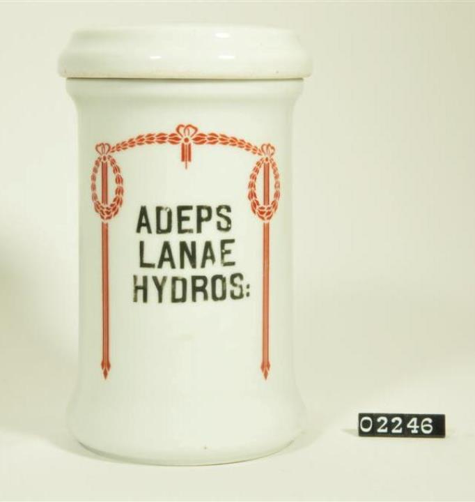 Zylinderförmiger Porzellantiegel mit Stülpdeckelrand, geschweiftem Rand und geschweiftem Fuß. Stülpdeckel mit Kehlung. Standring. Standboden plan. Jugendstilähnliche, rotbraune Randdekoration (Blattgirlande mit Bändern). Eingebrannte schwarze Signatur. Enthielt Lanolin
