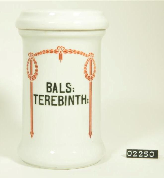 Zylinderförmiger Porzellantiegel mit Stülpdeckelrand, geschweiftem Rand und geschweiftem Fuß. Stülpdeckel mit Kehlung. Standring. Standboden plan. Jugendstilähnliche, rotbraune Randdekoration (Blattgirlande mit Bändern). Eingebrannte schwarze Signatur: Bals(amum): Terebinth(inae):. Enthielt Terpentin.