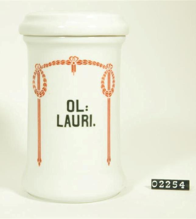 Zylinderförmiger Porzellantiegel mit Stülpdeckelrand, geschweiftem Rand und geschweiftem Fuß. Stülpdeckel mit Kehlung. Standring. Standboden plan. Jugendstilähnliche, rotbraune Randdekoration (Blattgirlande mit Bändern). Eingebrannte schwarze Signatur Ol(eum): Lauri. Enthält Lorbeeröl.