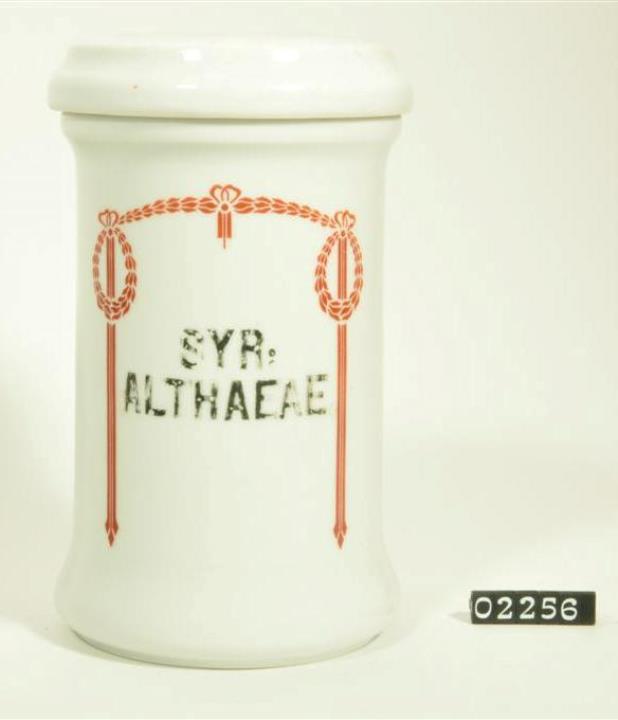 Zylinderförmiger Porzellantiegel mit Stülpdeckelrand, geschweiftem Rand und geschweiftem Fuß. Stülpdeckel mit Kehlung. Standring. Standboden plan. Jugendstilähnliche, rotbraune Randdekoration (Blattgirlande mit Bändern). Eingebrannte, teilweis verwaschene schwarze Signatur: Syr(upus): Althaeae.