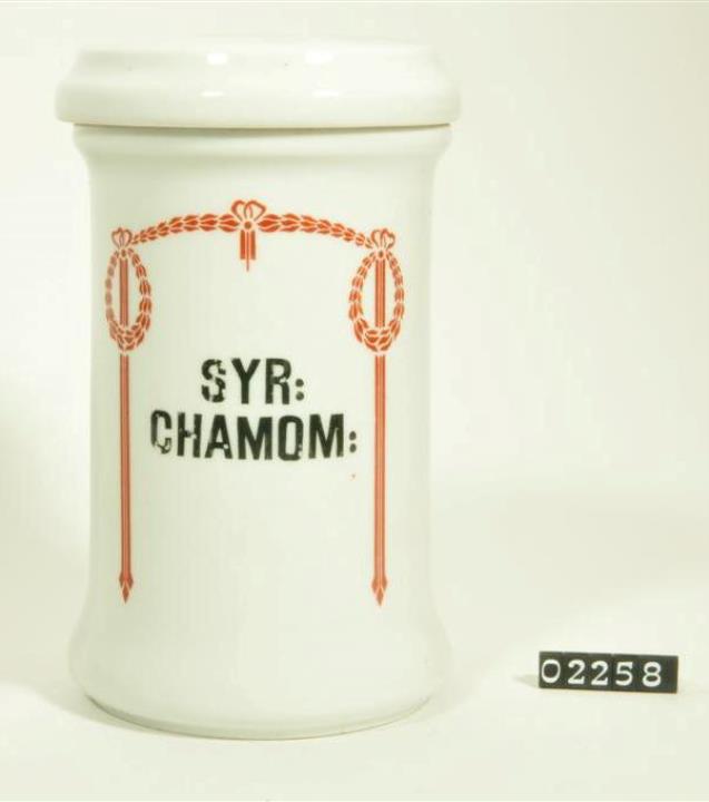 Zylinderförmiger Porzellantiegel mit Stülpdeckelrand, geschweiftem Rand und geschweiftem Fuß. Stülpdeckel mit Kehlung. Standring. Standboden plan. Jugendstilähnliche, rotbraune Randdekoration (Blattgirlande mit Bändern). Eingebrannte schwarze, verwaschene Signatur:Syr(upus):Chamom(illae):. Enthielt Kamillenblütensirup.