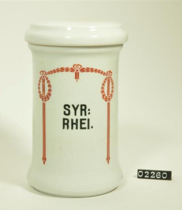 Zylinderförmiger Porzellantiegel mit Stülpdeckelrand, geschweiftem Rand und geschweiftem Fuß. Stülpdeckel mit Kehlung. Standring. Standboden plan. Jugendstilähnliche, rotbraune Randdekoration (Blattgirlande mit Bändern). Eingebrannte schwarze Signatur: Syr(upus):Rhei. Enthielt Rhabarbersirup.