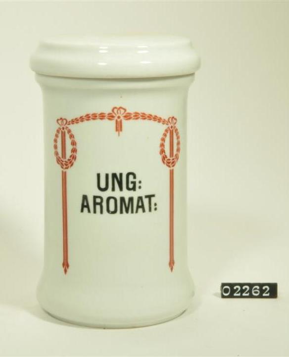Zylinderförmiger Porzellantiegel mit Stülpdeckelrand, geschweiftem Rand und geschweiftem Fuß. Stülpdeckel mit Kehlung. Standring. Standboden plan. Jugendstilähnliche, rotbraune Randdekoration (Blattgirlande mit Bändern). Eingebrannte schwarze Signatur: Ung(uentum): aromat(icum):.