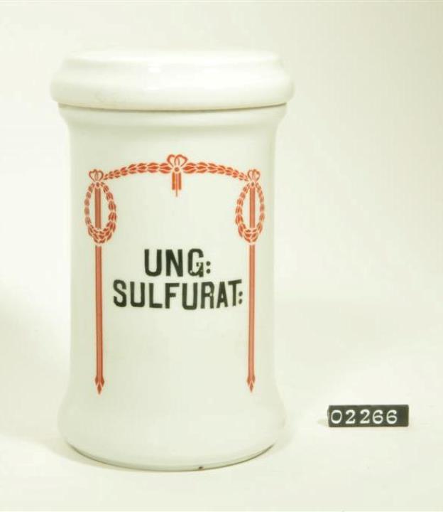 Zylinderförmiger Porzellantiegel mit Stülpdeckelrand, geschweiftem Rand und geschweiftem Fuß. Stülpdeckel mit Kehlung. Standring. Standboden plan. Jugendstilähnliche, rotbraune Randdekoration (Blattgirlande mit Bändern). Eingebrannte schwarze Signatur.