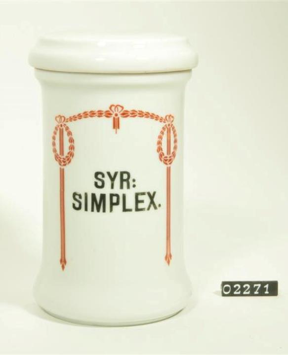 Zylinderförmiger Porzellantiegel mit Stülpdeckelrand, geschweiftem Rand und geschweiftem Fuß. Stülpdeckel mit Kehlung. Standring. Standboden plan. Jugendstilähnliche, rotbraune Randdekoration (Blattgirlande mit Bändern). Eingebrannte schwarze Signatur: Syr(upus): simplex. Enthielt Zuckersirup.