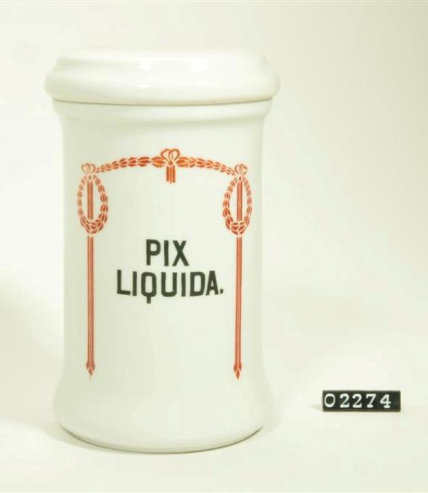 Zylinderförmiger Porzellantiegel mit Stülpdeckelrand, geschweiftem Rand und geschweiftem Fuß. Stülpdeckel mit Kehlung. Standring. Standboden plan. Jugendstilähnliche, rotbraune Randdekoration (Blattgirlande mit Bändern). Eingebrannte schwarze Signatur.