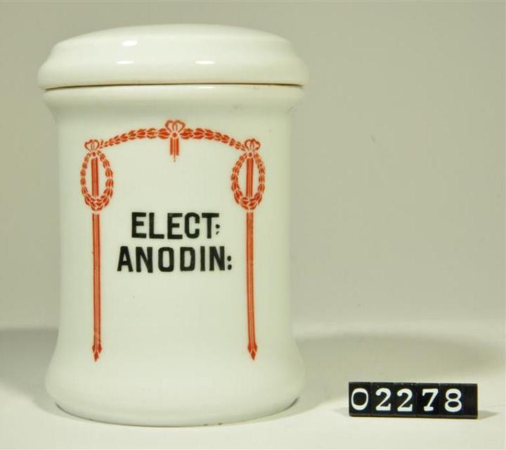 Zylinderförmiger Porzellantiegel mit Stülpdeckelrand, geschweiftem Rand und geschweiftem Fuß. Stülpdeckel mit Kehlung. Standring. Standboden plan. Jugendstilähnliche, rotbraune Randdekoration (Blattgirlande mit Bändern). Eingebrannte schwarze Signatur.