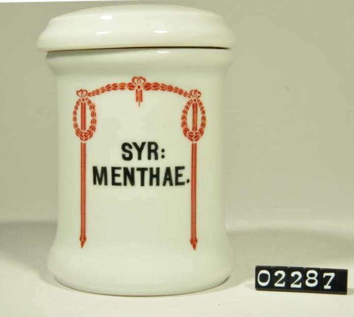 Zylinderförmiger Porzellantiegel mit Stülpdeckelrand, geschweiftem Rand und geschweiftem Fuß. Stülpdeckel mit Kehlung. Standring. Standboden plan. Jugendstilähnliche, rotbraune Randdekoration (Blattgirlande mit Bändern). Eingebrannte schwarze Signatur.