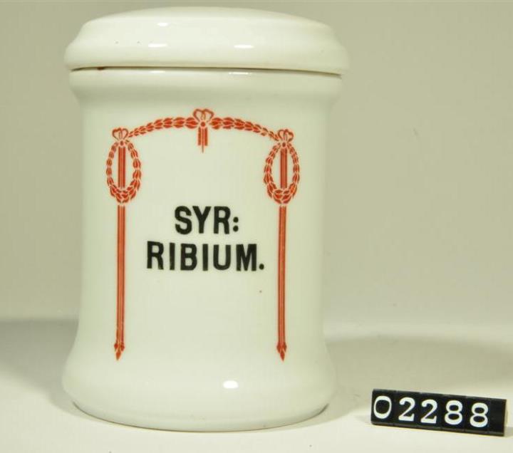 Zylinderförmiger Porzellantiegel mit Stülpdeckelrand, geschweiftem Rand und geschweiftem Fuß. Stülpdeckel mit Kehlung. Standring. Standboden plan. Jugendstilähnliche, rotbraune Randdekoration (Blattgirlande mit Bändern). Eingebrannte schwarze Signatur.