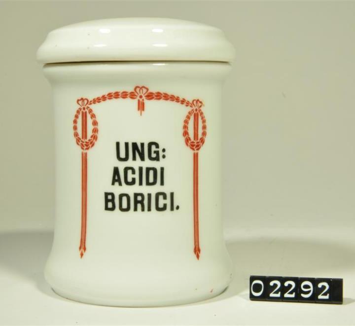 Zylinderförmiger Porzellantiegel mit Stülpdeckelrand, geschweiftem Rand und geschweiftem Fuß. Stülpdeckel mit Kehlung. Standring. Standboden plan. Jugendstilähnliche, rotbraune Randdekoration (Blattgirlande mit Bändern). Eingebrannte schwarze Signatur.