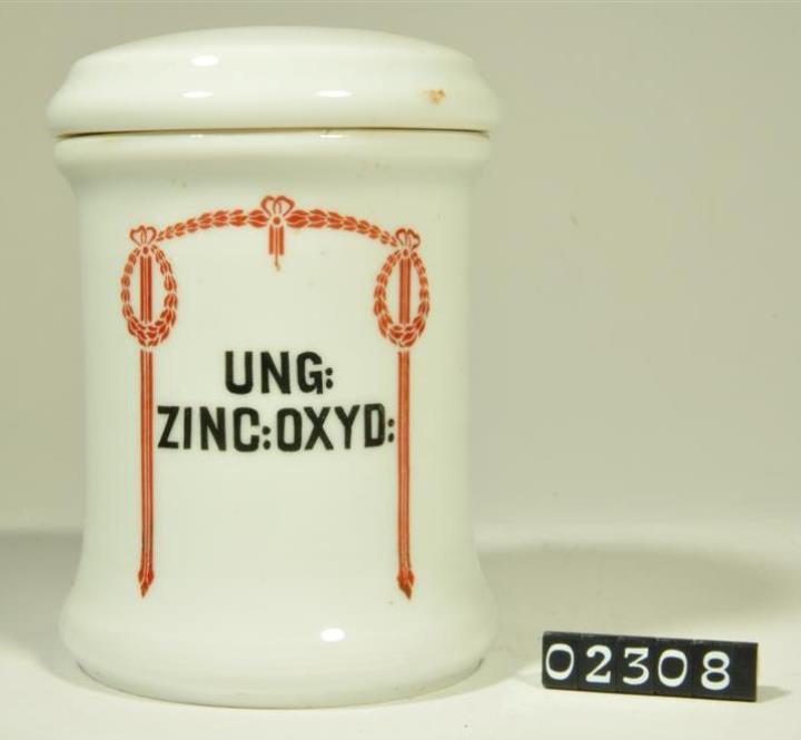 Zylinderförmiger Porzellantiegel mit Stülpdeckelrand, geschweiftem Rand und geschweiftem Fuß. Stülpdeckel mit Kehlung. Standring. Standboden plan. Jugendstilähnliche, rotbraune Randdekoration (Blattgirlande mit Bändern). Eingebrannte schwarze Signatur.