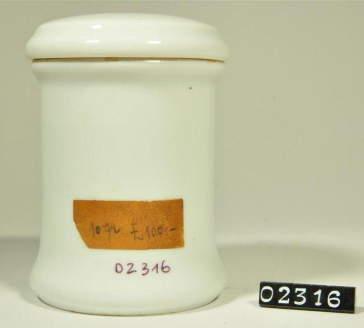 Zylinderförmiger Porzellantiegel mit Stülpdeckelrand, geschweiftem Rand und geschweiftem Fuß. Stülpdeckel mit Kehlung. Standring. Standboden plan. Jugendstilähnliche, rotbraune Randdekoration (Blattgirlande mit Bändern). Schwarz signiert