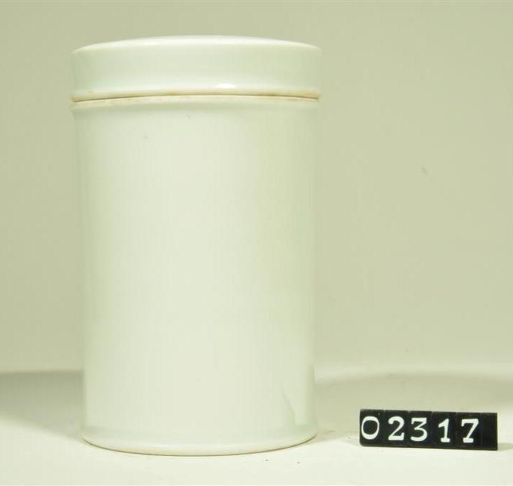 Zylinderförmiger Porzellantiegel mit Stülpdeckelrand, wenig ausladendem, schmalem, gerundetem Rand und Fuß. Flacher, kaum gewölbter Stülpdeckel mit gerader Wand und zartem Wulstrand. Standboden plan.