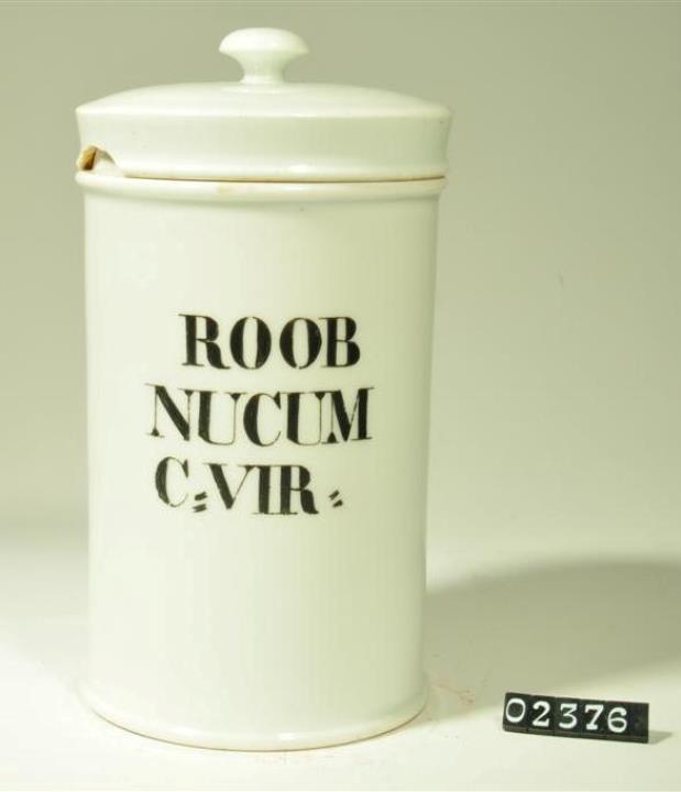 Zylinderförmiger Porzellantiegel mit Stülpdeckelrand, wenig ausladendem, schmalem, gerundetem Rand und Fuß. Flacher, kaum gewölbter Stülpdeckel mit gerader Wand und zartem Wulstrand sowie knopfförmigem Knauf. Standboden nach innen eingezogen. Eingebrannte schwarze Signatur. Enthielt Walnussschalensaft.