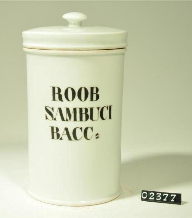 Zylinderförmiger Porzellantiegel mit Stülpdeckelrand, wenig ausladendem, schmalem, gerundetem Rand und Fuß. Flacher, kaum gewölbter Stülpdeckel mit gerader Wand und zartem Wulstrand sowie knopfförmigem Knauf. Standboden nach innen eingezogen. Eingebrannte schwarze Signatur. Enthielt den eingedickten Saft von den reifen Beeren des Holunderstrauches.