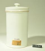Zylinderförmiger Porzellantiegel mit Stülpdeckelrand, wenig ausladendem, schmalem, gerundetem Rand und Fuß. Flacher, kaum gewölbter Stülpdeckel mit gerader Wand und zartem Wulstrand sowie knopfförmigem Knauf. Standboden nach innen eingezogen. Eingebrannte schwarze Signatur