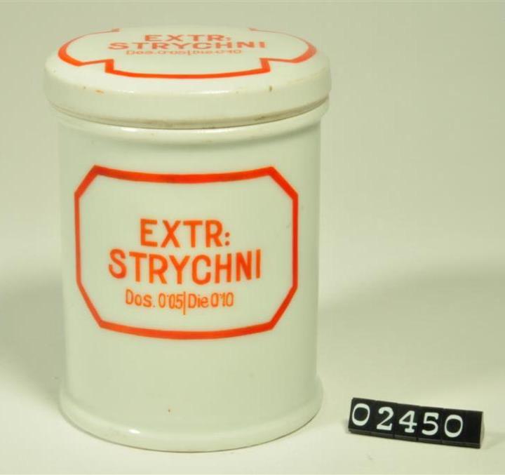 Zylinderförmiger Porzellantiegel mit Stülpdeckelrand, wenig ausladendem, schmalem, gerundetem Rand und Fuß. Flacher, zur Wand hin abgeschrägter Stülpdeckel mit kreuzförmiger Signatur mit Maximaldosenangabe. Standboden nach innen etwas eingezogen. Achteckiges, eingebranntes Schild, rot signiert.