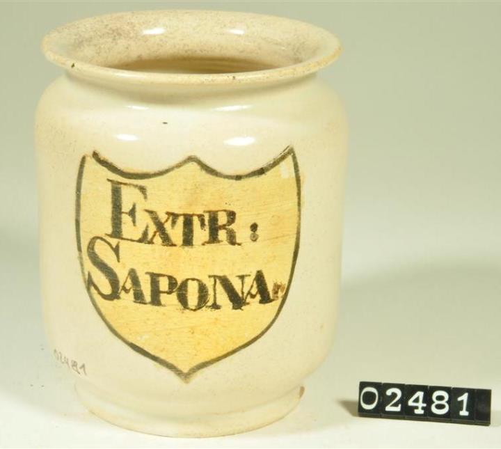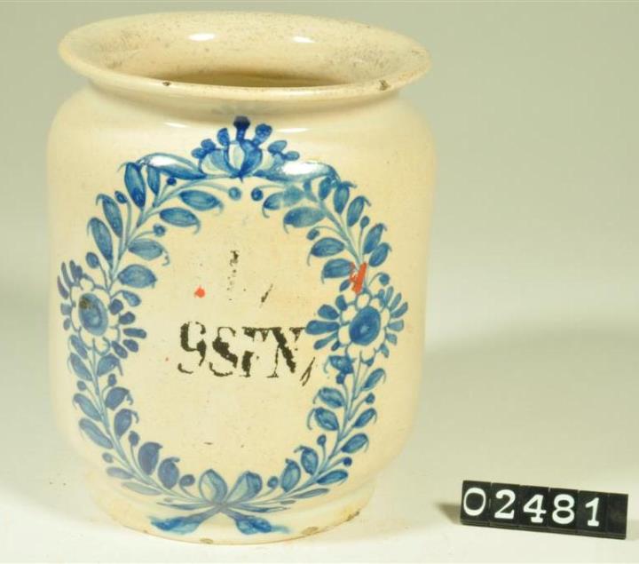 Zylinderförmiges Standgefäß mit abgesetztem Fuß, leicht eingezogenem Hals und ausgebogenem Rand. Kobaltblauer, ovaler Laubkranz, rotschwarz signiert (Reste). Schildförmiges Schild auf Rückseite, schwarz signiert