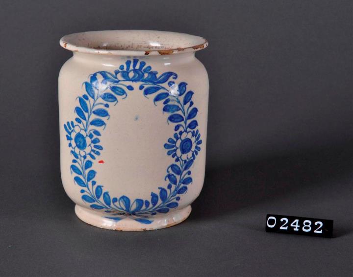 Zylinderförmiges Standgefäß mit abgesetztem Fuß, leicht eingezogenem Hals und ausgebogenem Rand. Kobaltblauer, ovaler Laubkranz. Schildförmiges Schild auf Rückseite, schwarz signiert
