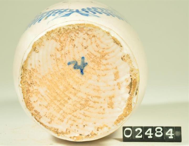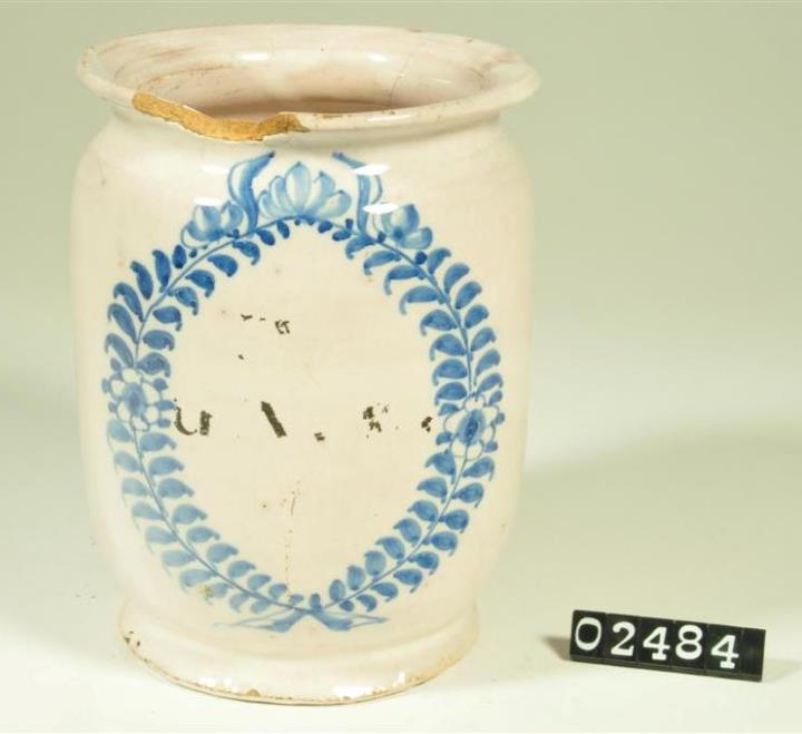 Zylinderförmiges Standgefäß mit abgesetztem Fuß, leicht eingezogenem Hals und ausgebogenem Rand. Kobaltblauer, ovaler Laubkranz. Schwarze Signaturreste. Mit Bodenmarke!