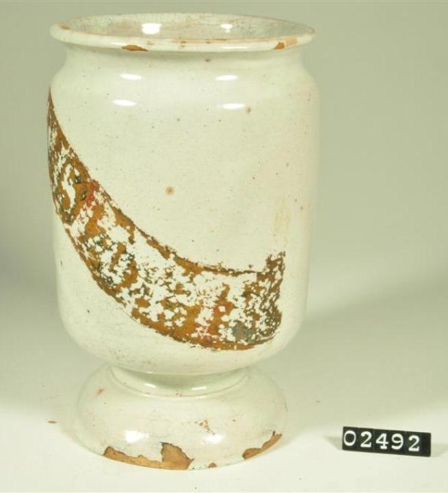 Zylinderförmiges Vorratsgefäß mit angesetztem Hohlfuß, leicht eingezogenem Hals und ausgebogenem Rand. Beschriftungsbanderole, teilweise unleserlich mit Kaltmalerei ausgeführt. Schwarz signiert