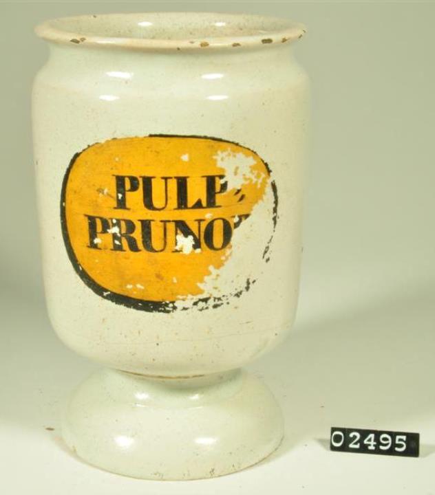 Zylinderförmiges Vorratsgefäß mit angesetztem Hohlfuß, leicht eingezogenem Hals und ausgebogenem Rand. Ovales, gelbes, schwarz umrandetes Schild, Kaltmalerei, schwarz signiert.