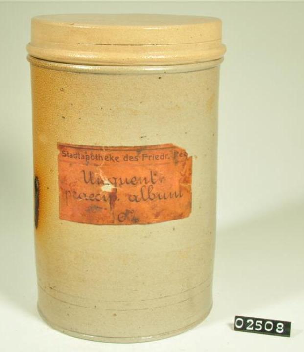 Zylinderförmiger Steinzeugtiegel mit Stülpdeckelrand, wenig ausladendem, schmalem Rand und Fuß. Flacher Stülpdeckel mit gerader Wand und zartem Rand. Standboden nach innen etwas eingezogen. Etikettiert