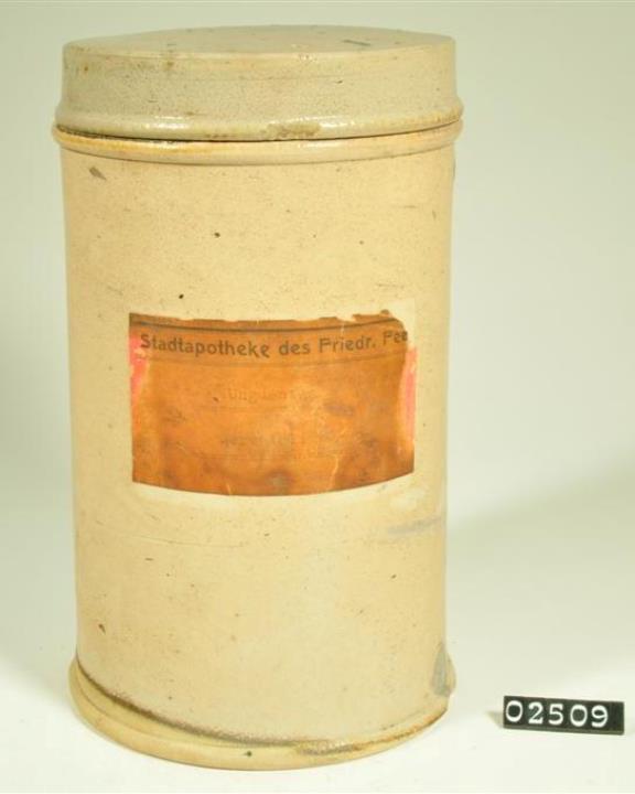 Zylinderförmiger Steinzeugtiegel mit Stülpdeckelrand, wenig ausladendem, schmalem Rand und Fuß. Flacher Stülpdeckel mit gerader Wand und zartem Rand. Standboden nach innen etwas eingezogen. Etikettiert
