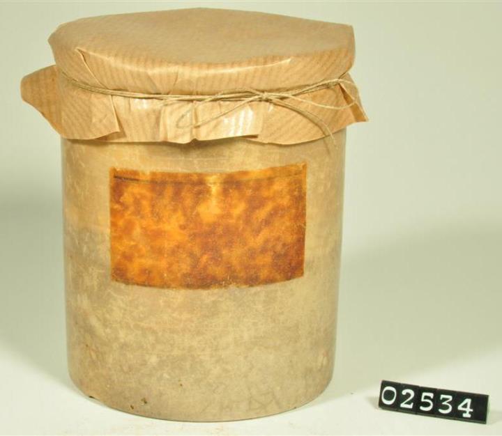 Zylinderförmiger, vollständig glasierter Tiegel aus Keramik mit Tektur. Rille unter dem gerundeten Mündungsrand. Standboden nach innen etwas eingezogen. Mit unleserlichem Etikett.
