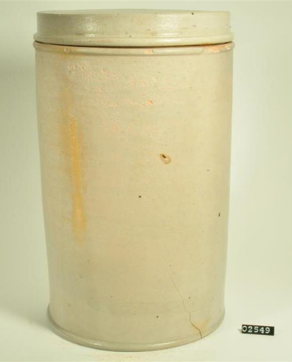 Zylinderförmiger Steinzeugtiegel mit Stülpdeckelrand, wenig ausladendem, schmalem Rand und Fuß. Flacher Stülpdeckel mit gerader Wand und zartem Rand. Standboden nach innen etwas eingezogen.