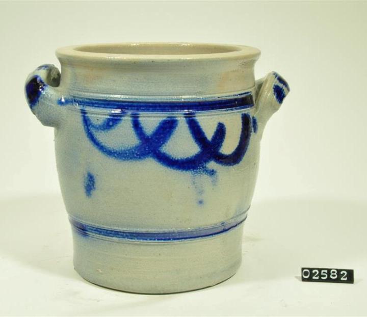 Bauchiger Doppelhenkeltopf mit horizontal aufgesetzten, aufgebogenen Wulsthenkeln. Vollständig salzglasiertes, hellgraues Steinzeug mit blauem Dekor und blauen Rillen. Verstärkter Mündungsrand. Standboden leicht aufgewölbt.