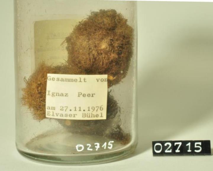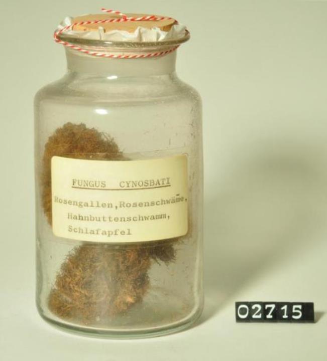 Rundes, farbloses Pulverglas mit Stopfen (Korkstopfen). Boden mit Hefteisenabriss undleicht trichterförmig, ausladenedem Mündungsrand. Signiert