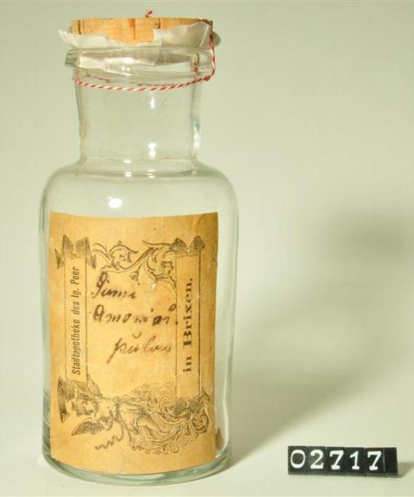 Rundes, farbloses Pulverglas mit Stopfen (Korkstopfen). Leicht hochgestochener Boden mit Hefteisenabriss und umgelegtem Faden beim Mündungsrand. Etikettiert