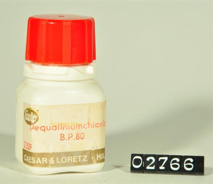 Weiße Kunststoff-Vierkantflasche (Weithalsflasche) aus Polyethylen mit rotem Schraubverschluss. Quadratischer Boden. Enthält Dequaliniumchlorid.