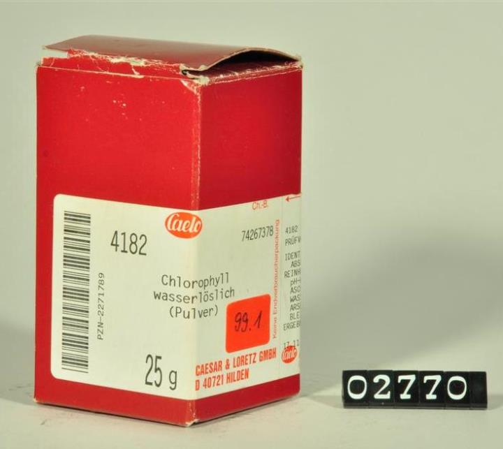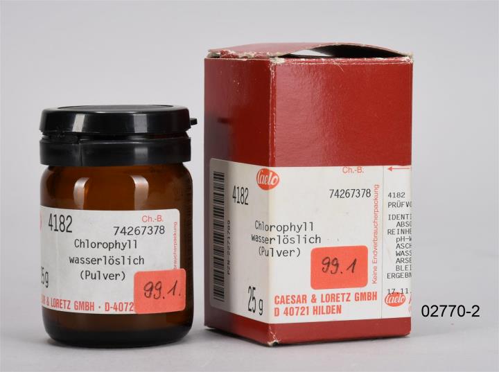 Braune, zylindrische Glasflasche mit abfallender Schulter (Weithalsflasche) mit schwarzem Schraubverschluss. Verpackt in braunroter Medikamentenschachtel. Etikettiert. Mit Analysenzertifikat vom17.11.1997. Enthält Chlorophyll.