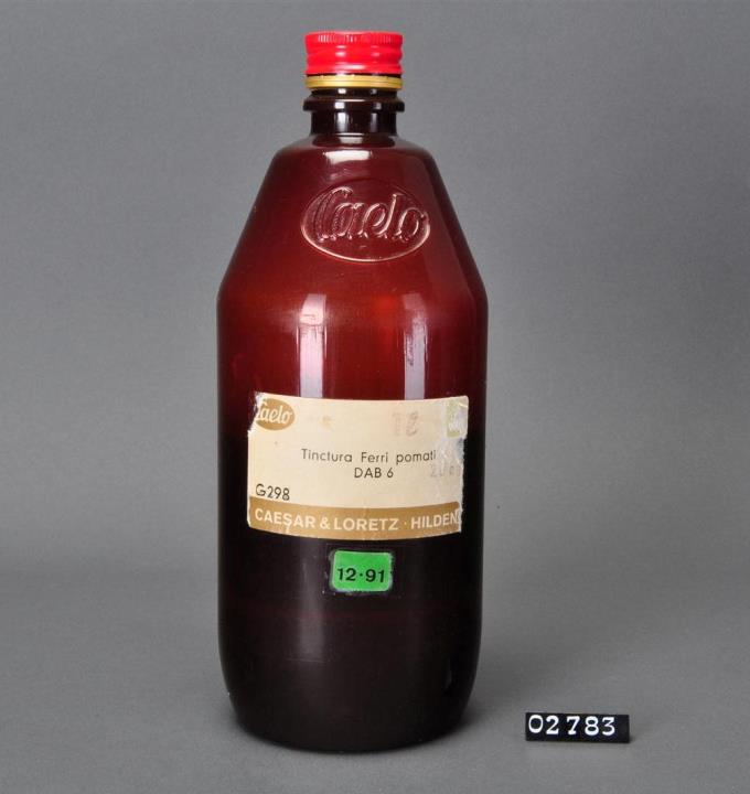 Runde, braune Enghalsflasche aus Kunststoff mit rotem Schraubverschuss aus Blech. Etikettiert. Im Dezember 1991 aus dem Sortiment genommen (grünes Schild). Enthält Apfelsaure Eisentinktur.