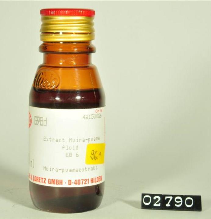 Runde, braune Enghalsflasche mit rotem Schraubverschuss. An der steilen Schulter in ovaler Kartusche "CAELO" eingeprägt. Etikettiert
