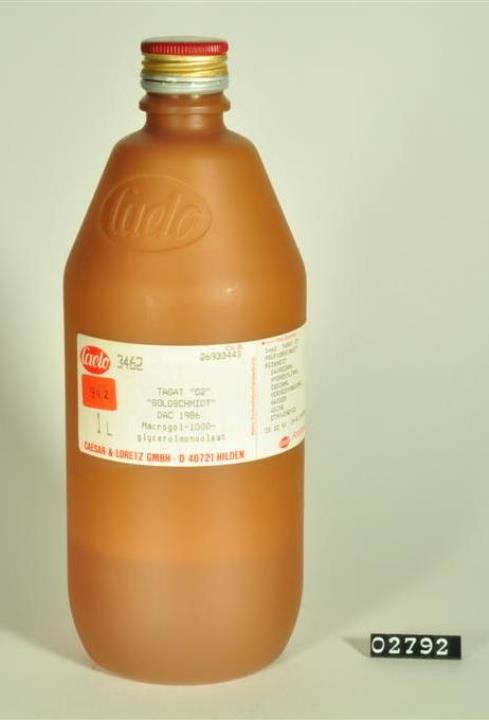 Runde, milchig braune Enghalsflasche mit rotem Schraubverschuss. An der steilen Schulter in ovaler Kartusche "CAELO" eingeprägt. Etikettiert