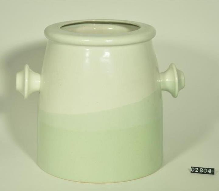 Konisches, innen und außen glasierters Ansatzgefäß in drei Farben (weißlich und hellgrün) mit zwei seitlichen Griffen. Leicht eingezogene Schulter mit nach außen gerundetem Mündungsrand, der flach nach innen verläuft. Standboden plan und unglasiert.