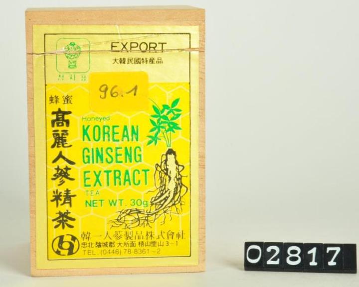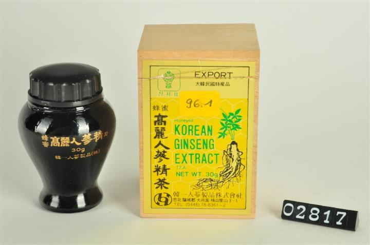 Schwarze, bauchige Flasche, die sich zum leicht nach außen geschwungenen Fuß verjüngt. Schwarzer Schraubverschluss. Kleiner, weißer Kunststofflöffel. Goldene chinesische Schriftzeichen. Hochrechteckige Spanschachtelverpackung mit Steckdeckel. Etikettiert