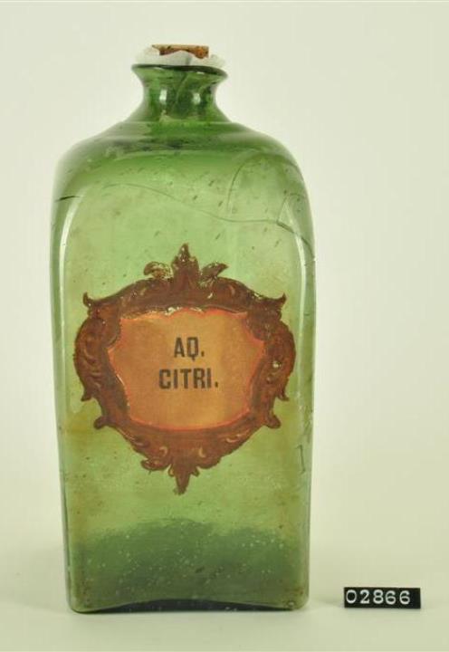 Vierkantflasche aus grünem Glas mit trichterförmig ausgebogener Mündung und Tektur (alt). Bis zum Halsansatz überstochene Wandung. Hochgestochener Boden mit rundem Hefteisenabriss. Mit Korkstopfen verschlossen. Kaltmalerei um geschwungenem Papierschild. Schwarz signiert.