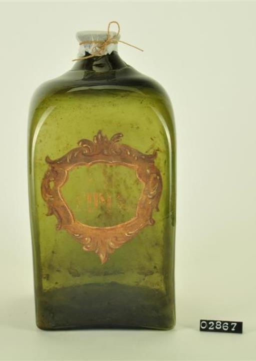 Vierkantflasche aus grünem Glas mit trichterförmig ausgebogener Mündung und Tektur (neu). Bis zum Halsansatz überstochene Wandung. Hochgestochener Boden mit rundem Hefteisenabriss. Geschwungene Kartusche und Signatur in Kaltmalerei. Goldfarben signiert