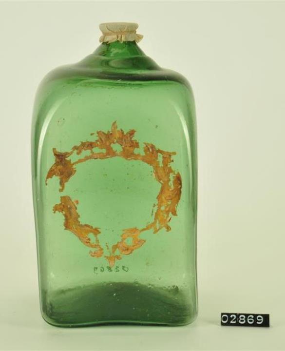 Vierkantflasche aus grünem Glas mit trichterförmig ausgebogener Mündung und zugebundener Tektur (historisch). Bis zum Halsansatz überstochene Wandung. Hochgestochener Boden mit rundem Hefteisenabriss. Geschwungene goldfarbige Kartusche in Kaltmalerei, ohne Signatur .